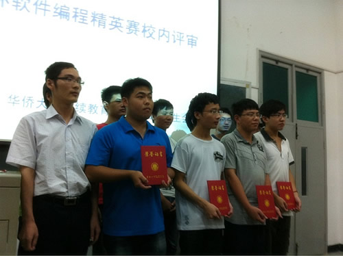 最后,11级软件班的刘志忠、林怡敏、苏志达、蔡子为为代表的四个小组获得了此次编程大赛校内评审的四个优秀项目。该班的指导老师林宁钗对这四组成员颁发奖状。北大青鸟教务处黄伟明也对此次比赛进行肯定及对12级学生进行勉励,并预祝11级软件班同学在全国评审中取得好成绩。